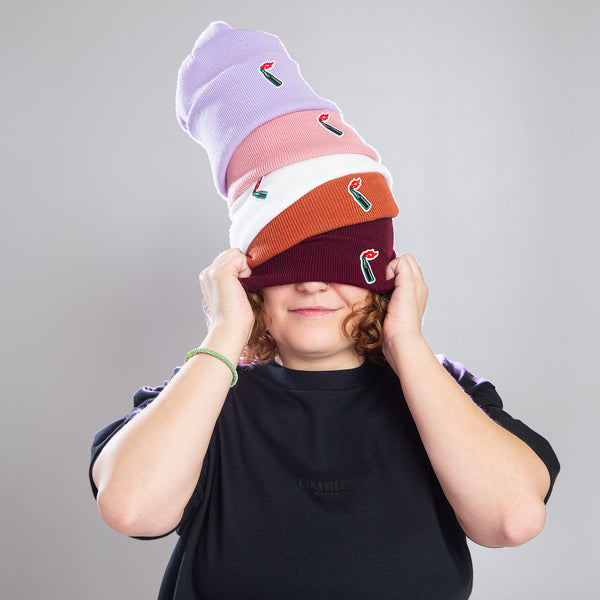 Beanie in Schwarz, Olive, Burgund / Weinrot / Maroon, Grau meliert, Rosa, Bronze, Fluorescent Pink, Weiß und Lavender.